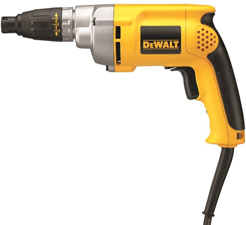 Dewalt Corded Screwdriver, Depth-Sensitive, Model: DW266, 120 V, 6.5 A, 132 in-lb Maximum, 0 - 2500 rpm, Standard Clutch, Variable Speed Reversing Control, 8 ft Cord Length, Steel Housing, Yellow Handle, 11-1/2 in Overall Length, Includes: TEKS Screw, NO 14 Fastener, For Drywall, Deck Construction